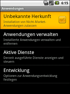 Betätigen Sie die Menüschaltfläche des Gerätes und wählen Sie den Befehl "Einstellungen". Über den Punkt "Anwendungen" gelangen Sie zur Option "Unbekannte Quelle/Herkunft", die Sie aktivieren müssen.